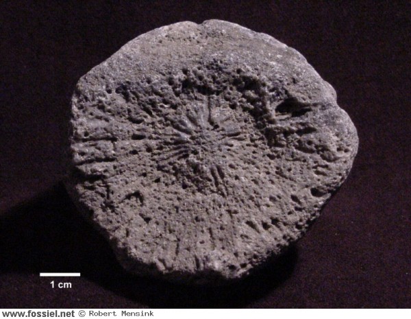 Meest voorkomende Ordovicische zwerfsteenspons van Oost-Nederland (WWW-gebied). Zwerfsteensponzen zijn in het Menapien (tussen Tertiair en laat Pleistoceen) getransporteerd door de Baltische stroom. Je ziet hier de bovenkant van het basisdeel van de spons.