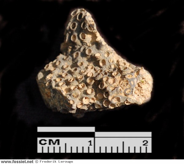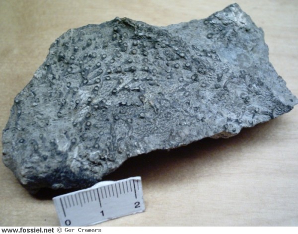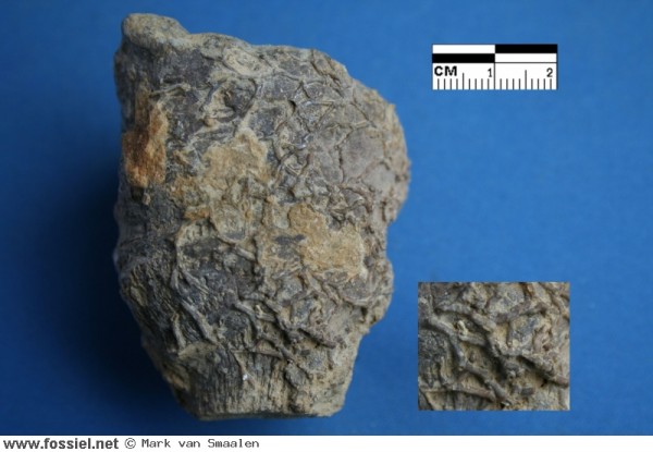 Een tabulate koraal op de bovenzijde van Alveolites sp. uit Weinsheim.