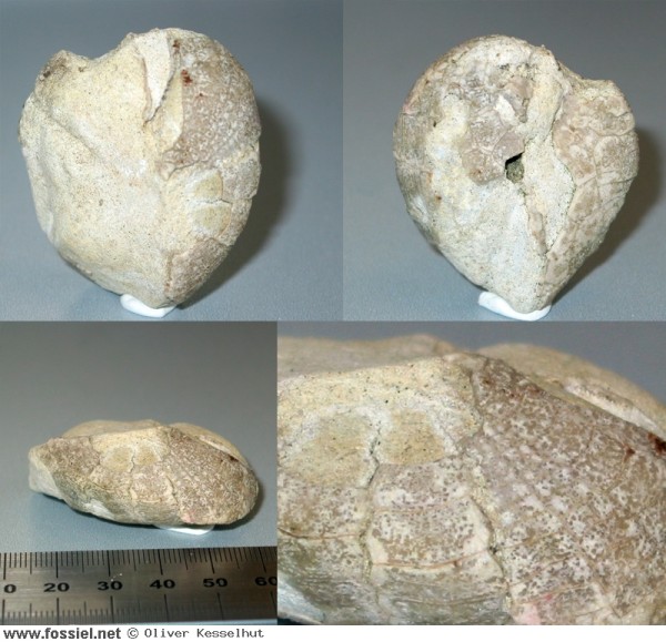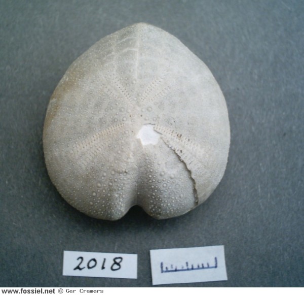 Deze tamelijk verweerde Cardiaster komt uit de Kalksteen van Vijlen, door die de Selzerbeek stroomt. De egel is 3,8 cm lang.