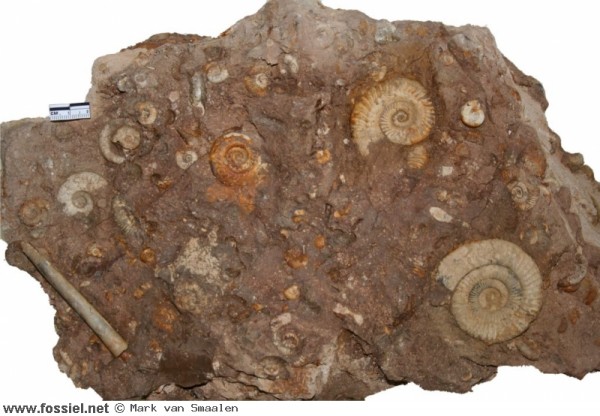 Deze steen met voornamelijk bovengenoemde ammonieten was in klei ingebed, en is gevonden in de groeve van Feuguerolles. Ook in de steen zit Hildoceras bifrons.