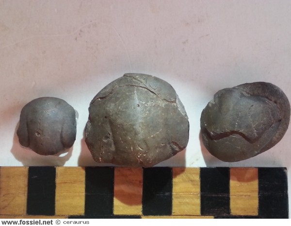 Zeldzamere Ectillaenus soort uit de Sarka formatie. Links 2 cephala, rechts een pygidium.