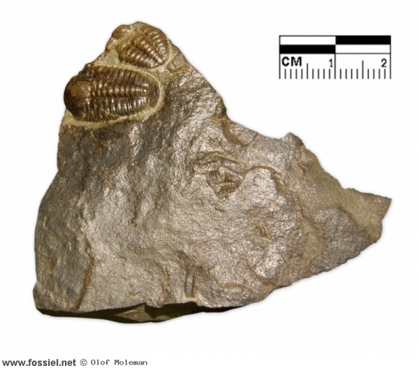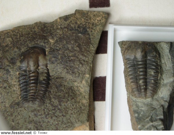 Twee bijna complete stukken. Het linkerstuk heeft geen pygidium. E.hoffi is een van de jongste trilobieten uit de Jince formatie.