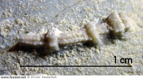 Gevonden in de kalksteen van Lanaye. Deze serpulide groeide op het skelet van een Hemipneustes sp.