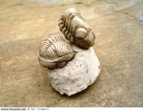 Aankoop. Twee exemplaren van de bekendste trilobiet van de Trilobitenfelder te Gees bij Gerolstein. Het schijnt dat ca. 90% van de gevonden trilobieten aldaar tot deze soort behoort.