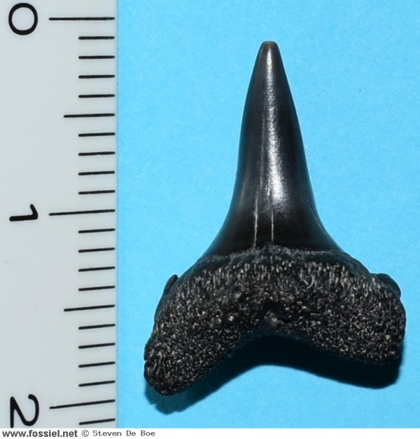 onvolledige tand: zijspits ontbreekt kenmerken: vrij dikke wortel, geen duidelijke voedingsgroeve, kroonbasis steekt aan de platte zijde van de kroon uit over de wortel