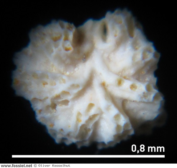 Let op: er worden 3 foto's van deze bryozoa-soort getoont: 1. een jong basis-gedeelte met radiaal verlopende fascicels. De gedeeltes tussen deze fascicels worden "maculae" genoemt. 2. een iets ouder basisstuk met zicht op de pluriseriele zooecia en zo genaamde "nanozooecia" (nano = dwerg), dus kleine zooecia, die kwa vorm en structuur op de autozooecia lijken, maar over geen reproductie- of verteringsfuncties beschikken. 3. een erect, hol takje dat een latere groeiphase afbeeld. Als restanten van de incrusterende phase beschikt de erecte vorm nog over de boven genoemde maculae. De erecte stadia werden tot de revisie van Voigt (1981/1982) tot de soort Cavaria ramosa gerekend.