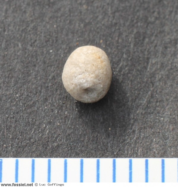 Deze zee-egel ( vuursteenkern ), gevonden in het vuursteeneluvium van de groeve CBR in Haccourt, meet amper 3.5 mm ( L ).