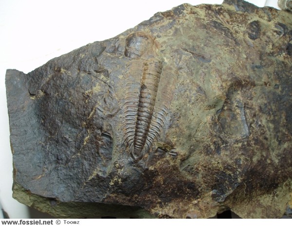 Klassieke trilobiet uit het Barrandium. Vervelling, maar het stuk heeft alles; thoracopygidium, cephalon en de 2 librigena (vrije wangen). Complete (en intacte) volwassen beesten zijn zeldzaam, maar dit geldt voor alle trilobieten.