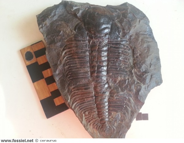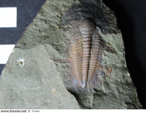 Net volgroeid jong compleet stuk vervelling. Eén van de losse wangen (librigena) zie je linksonder de trilobiet liggen. Gesloten vindplaats.