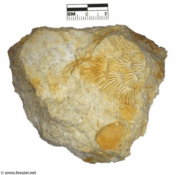 Negatief van de zijkant van deze koraal. Gevonden in de Meerssener kalk (IV f3–5).