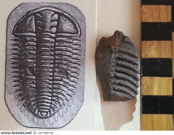 Thorax-deel. Pliomerops is zeldzaam. Elke vondst is bijzonder. Links op het stukje knol zie je een phacopid oog van vermoedelijk Ormathops.