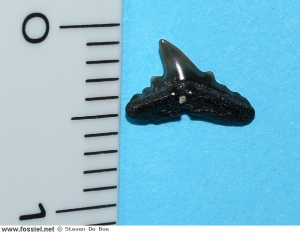 De kroon is breed en laag in vergelijking met de totale hoogte van deze kroon. Het kroonvlak is licht buigend in de richting van de voedingsgroef (zie zijkant tand). De bijspitsen zijn klein en zijn bevestigd op de snijranden. De bovenste bijspits langs beide zijden is opmerkelijk groter. In het midden van de wortel bevindt zich onderaan een duidelijke inkeping. De worteluiteinden zijn afgerond.