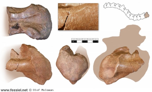 Spinosaurus-achtige dorsale wervel, waarschijnlijk Sigilmassasaurus. Aan de zijkant zijn een serie vraatsporen te zien van onbekende oorsprong.