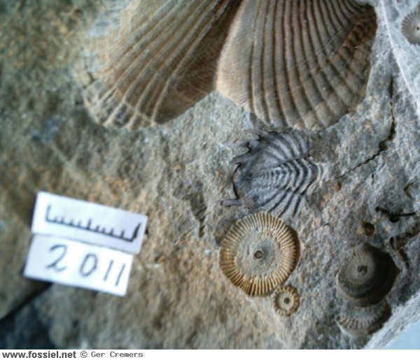 Schitterend pygidium met stekels, met nog meer schitterend materiaal in dezelfde steen (diverse spiriferen, gastropode, zelfs een orthoceer). Dit exemplaar is gepubliceerd in Gea en Grondboor en hamer. Uiteraard is ook het negatief aanwezig.