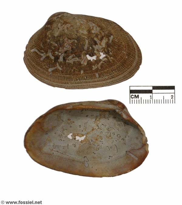 Tapijtschelp met borende wormen, mogelijk Polydora.