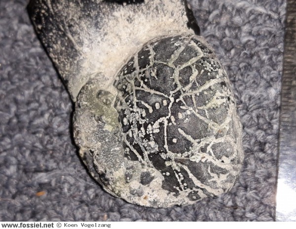Oorspronkelijk een onooglijke vondst van het strand van Katharinenhof. Vuursteenbrok voorzichtig opengetikt en daarna in een zoutzuurbadje gedompeld.